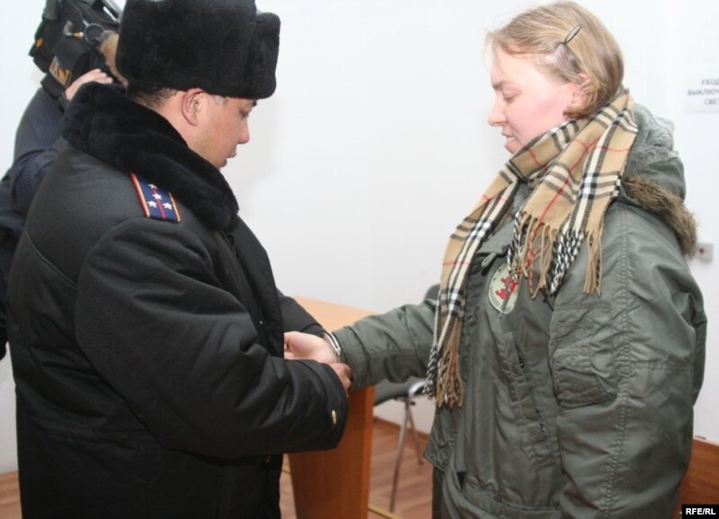 Офицер полиции надевает наручники на осужденную на два года тюрьмы Елизавету Дреничеву. Алматы, 9 января 2009 года.
