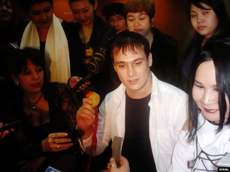 Илья Ильин демонстрирует журналистам свою золотую олимпийскую медаль. Уральск, 28 февраля 2009 года.