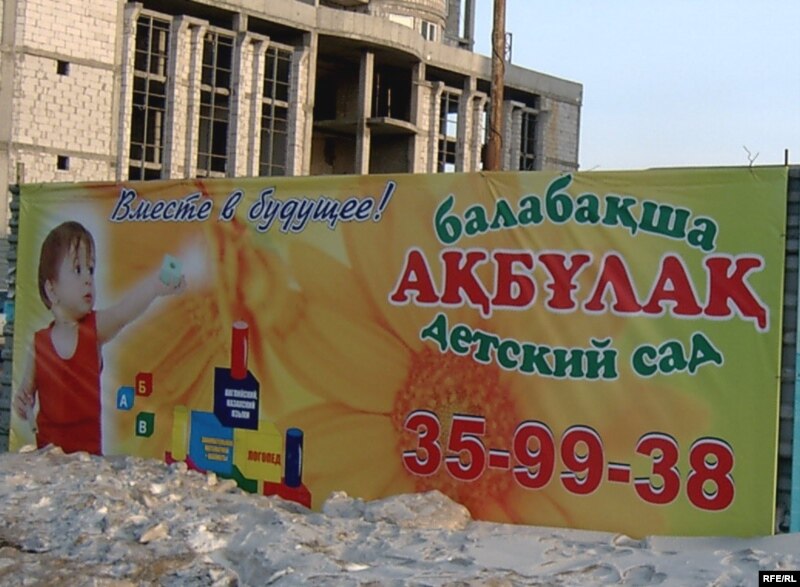 Реклама частного детского сада «Акбулак» на строящемся объекте на улице Момышулы. Астана, март 2009 года.