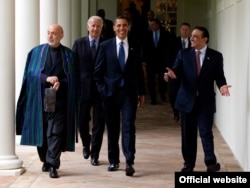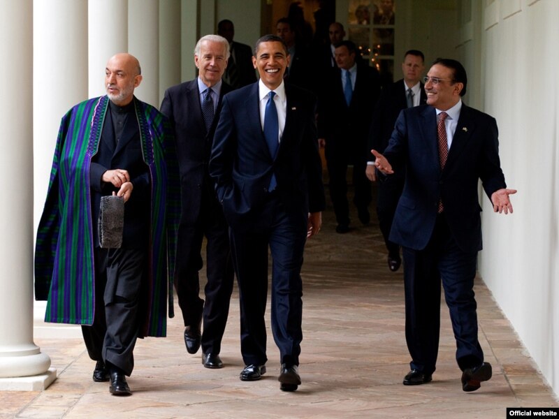 На встрече в Вашингтоне президенты: Афганистана - Хамид Карзай, США - Барак Обама, Пакистана - Асиф Али Зардари. 6 мая 2009 года.