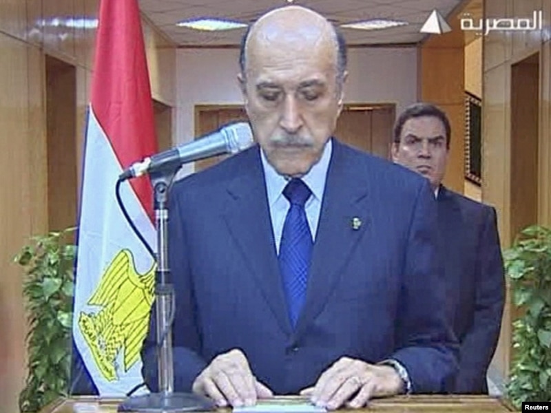 государственному телевидению Египта сказал:- В это тяжелое время, которое переживает страна, президент Мубарак решил уйти с поста президента. Он поручил верховному совету вооруженных сил взять контроль над управлением государством. Да хранит нас Бог.