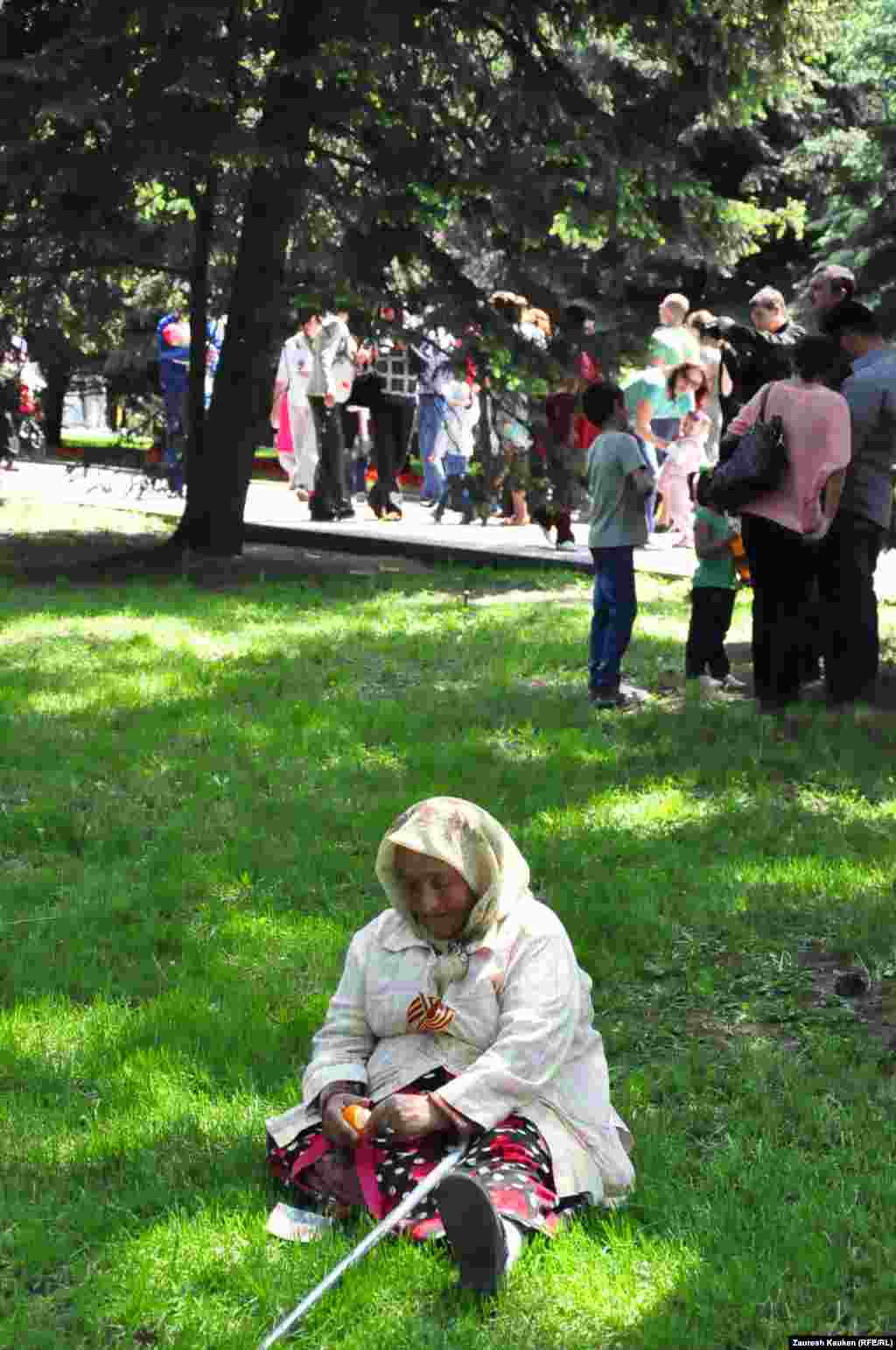 Женщина собирает милостыню на праздновании Дня Победы в Парке имени 28 гвардейцев-панфиловцев. Алматы, 9 мая 2013 года.