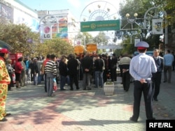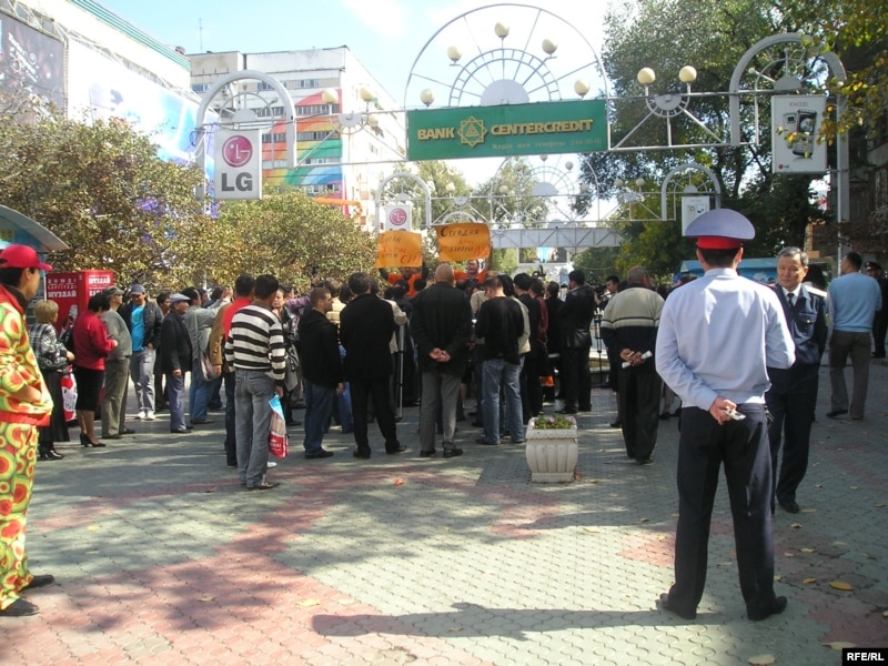 Полицейские наблюдают за акцией протеста в поддержку Евгения Жовтиса. Алматы, 23 сентября 2009 года.
