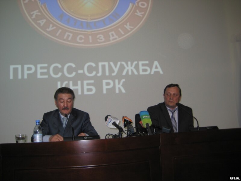 Пресс-секретарь КНБ Кенжебулат Бекназаров и руководитель оперативно-следственной группы КНБ Владимир Петровский озвучивают обвинения против Мухтара Джакишева и его сторонников. Астана, 1 июня 2009 года.