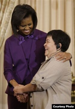Жена президента США Мишель Обама и бывшая политзаключенная Мутабар Таджибаева. Вашингтон, 11 марта 2009 года.