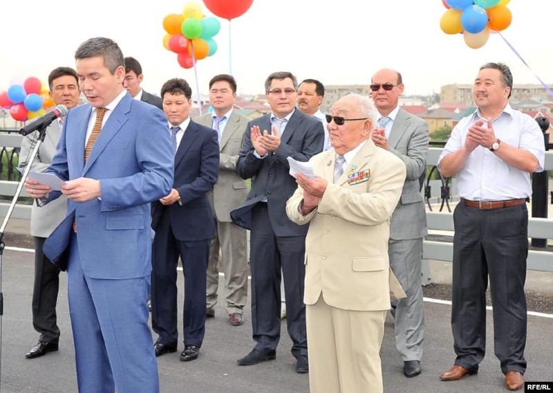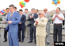 Чиновники на открытии моста. Аким Атырауской области Бергей Рыскалиев (слева) зачитывает поздравительный текст. Атырау, 22 июля 2009 года.