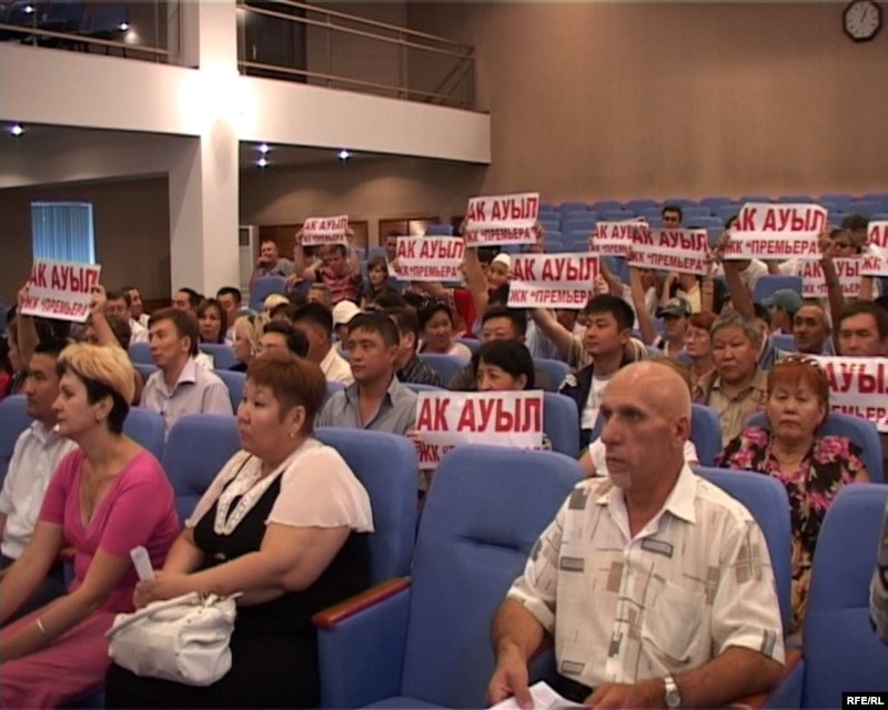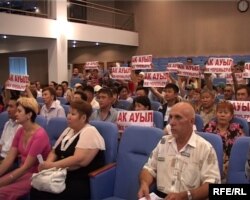 Участники акции протеста на собрании в акимате Алматинской области. Талдыкорган, 19 августа 2009 года.