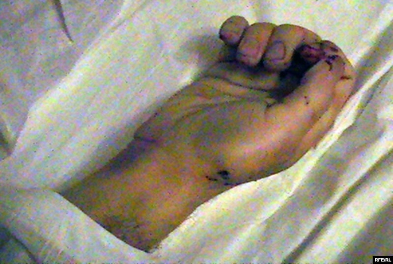 На теле Азамата Каримбаева были видны наложенные после судебно-медицинской экспертизы швы. С правой стороны живота были видны огромные синяки. На подушечках пальцев были заметны колотые раны. На левой руке имелся глубокий порез и след, по-видимому, от укола в области локтевого сгиба.