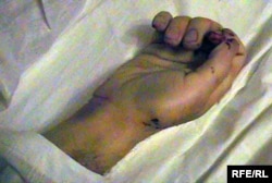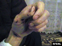 Левая рука Азамата Каримбаева с колотыми ранами и глубоким порезом. Его жена утверждает, что это – следы пыток. Поселок Шубарши, 27 декабря 2009 года.