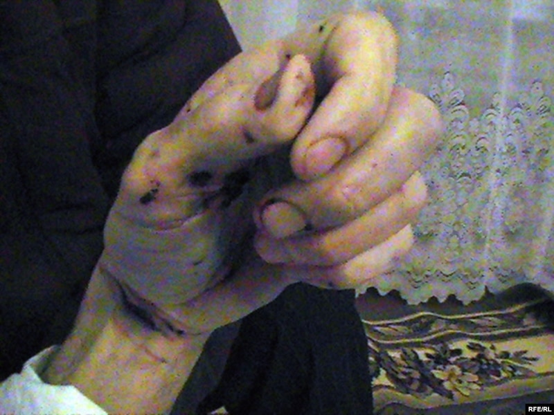 Правая рука Азамата Каримбаева с колотыми ранами. Его жена утверждает, что это – следы пыток. Поселок Шубарши, 27 декабря 2009 года.