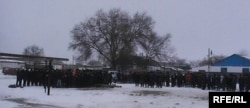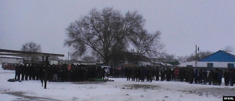 Жители села и родственники Азамата Каримбаева во время молитвы «Жаназа» в день похорон. Поселок Шубарши, 28 декабря 2009 года.