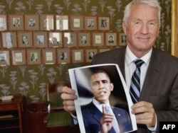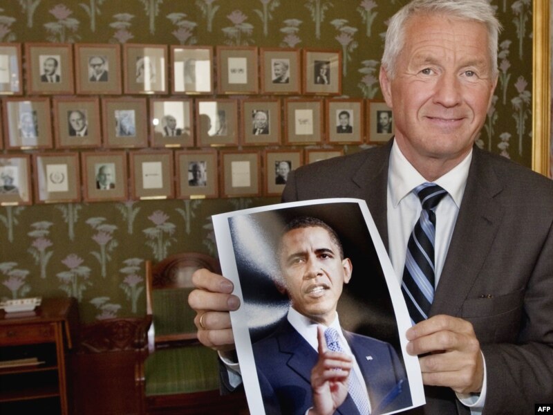 Председатель Норвежского Нобелевского комитета Турбьорн Ягланд демонстрирует фотопортрет Барака Обамы в день награждения его Нобелевской премией мира. Осло, 9 октября 2009 года.