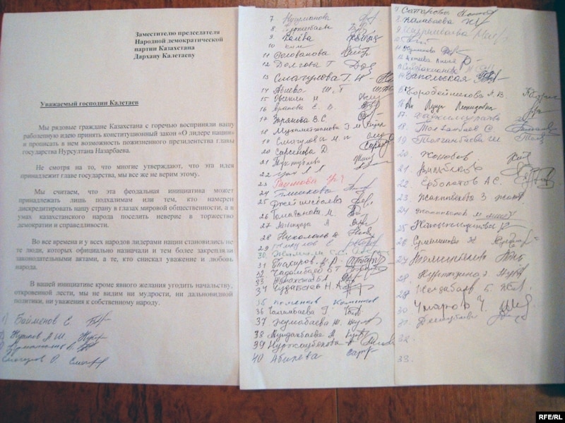 Письмо активистов партии «Азат» заместителю председателя партии «Нур Отан» Дархану Калетаеву, в котором критикуют идею пожизненного президентства Назарбаева. Талдыкорган, сентябрь 2009 года.