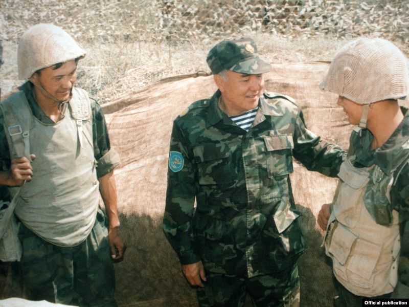 Президент Нурсултан Назарбаев беседует с солдатами после учений.