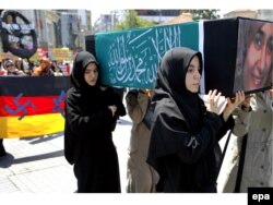 Мусульманки несут символический гроб с изображением убитой египтянки Шербени во время протеста напротив здания германского посольства в Стамбуле. 17 июля 2009 года.