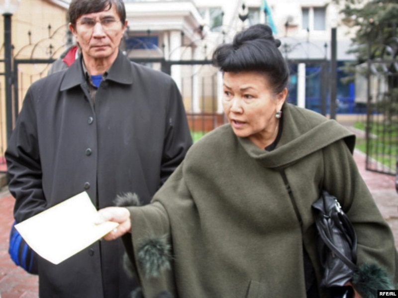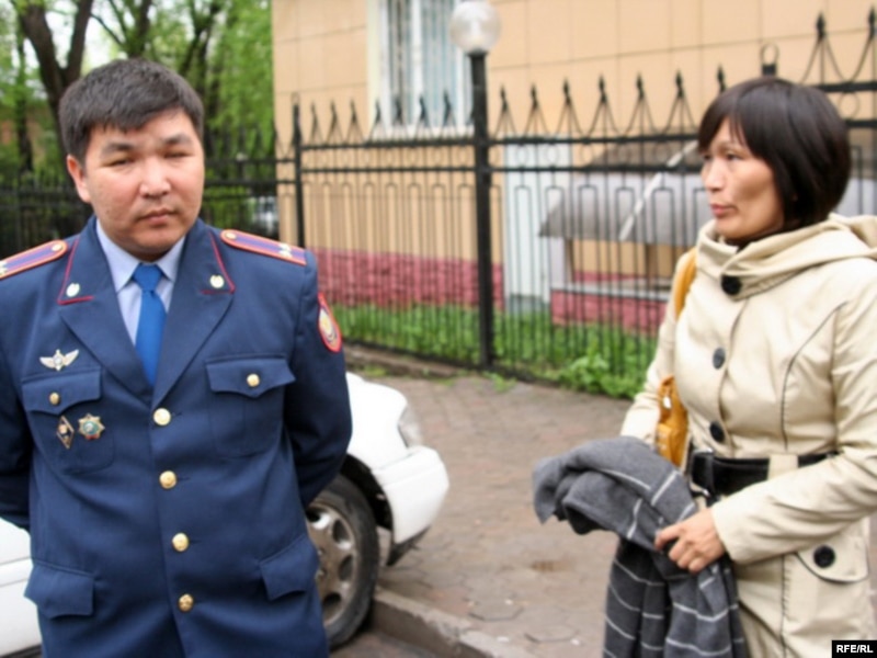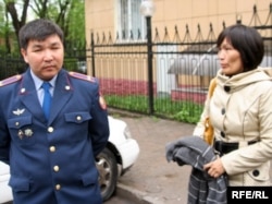 Поэтесса Айсулу Кадырбаева высказывается в адрес суда и полиции. Слева от нее – Жасарал Куанышалин. Алматы, 2 мая 2010 года.