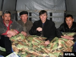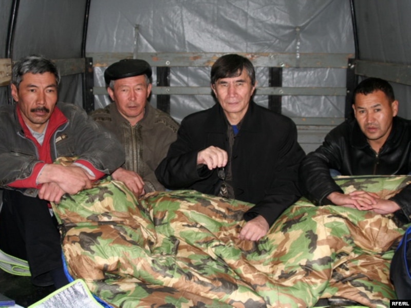 Участники голодовки продолжают акцию протеста в кузове грузовой машины во дворе офиса партии "Алга". Алматы, 2 мая 2010 года.