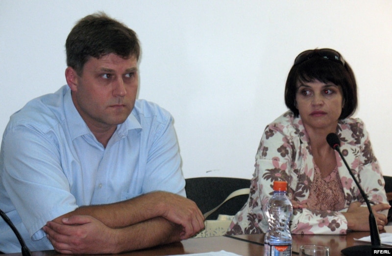 Адвокат Сергей Уткин и заместитель главного редактора газеты "Республика" Оксана Макушина на пресс-конференции. Алматы, 25 августа 2009 года.