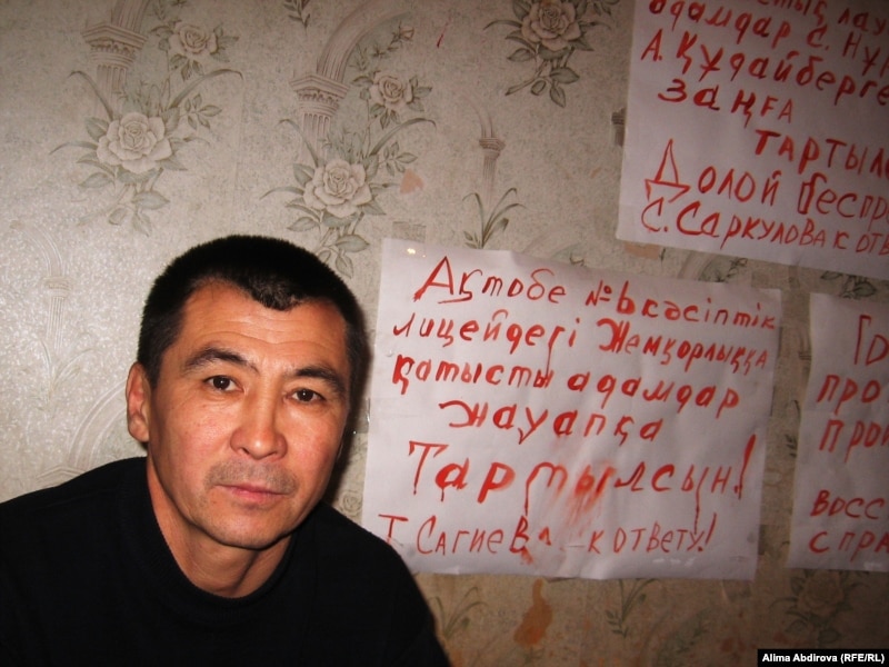Базарбек Масабаев, бывший мастер производственного обучения лицея Актобе №6, проводит акцию голодовки в знак протеста против своего увольнения.