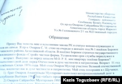 Фрагмент письма прапорщика Сайранбека Омарова первому заместителю министра обороны генерал-лейтенанту Болату Сембинову.