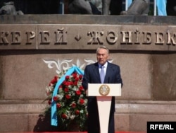 Президент Казахстана Нурсултан Назарбаев выступает с речью на открытии памятника ханам Керею и Жанибеку. Астана,1 июня 2010 года.