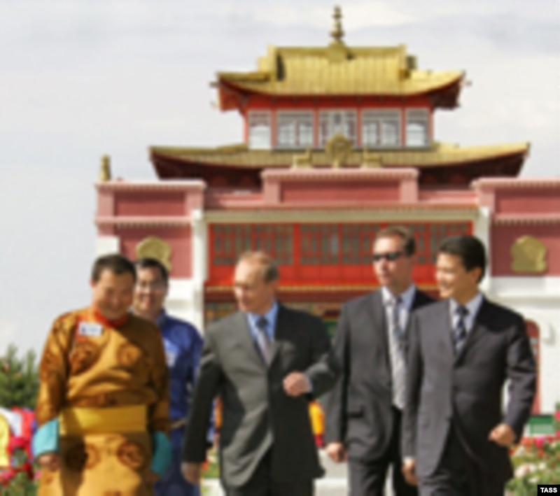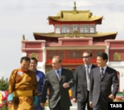 Президент России Владимир Путин (в центре), президент Калмыкии Кирсан Илюмжинов (справа) и духовный лидер калмыцких буддистов Тело Тюлку Ринпохе (слева) во время посещения буддистского храма. Элиста, 17 июня 2005 года.