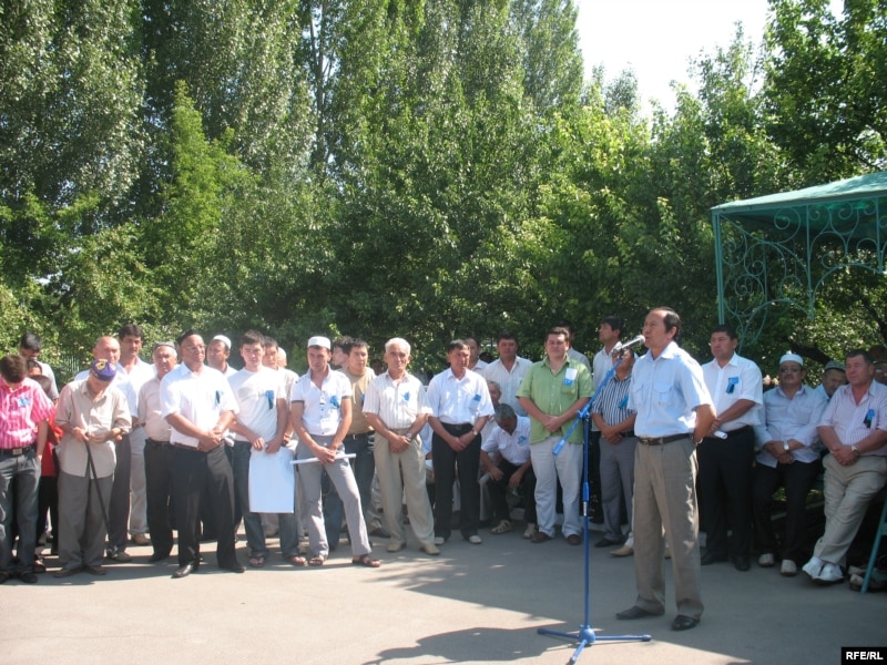 Кахарман Кожамбердиев, заместитель председателя Всемирного конгресса уйгуров, выступает перед участниками поминок по погибшим в Синьцзяне. Алматы, 13 августа 2009 года.