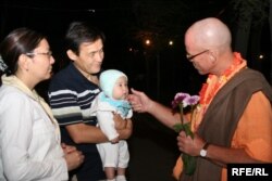 Говинда Свама, координатор Международного общества сознания Кришны по Центральной Азии (справа), благословляет младенца по просьбе его родителей. Община кришнаитов Казахстана, 14 августа 2009 года.