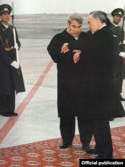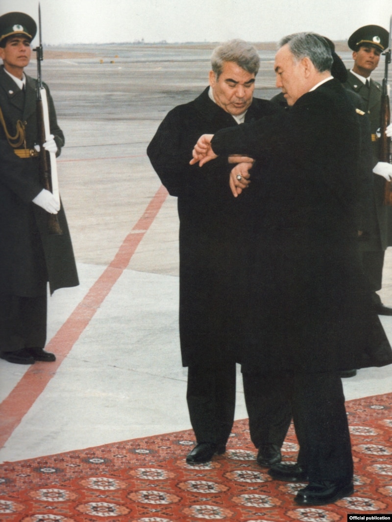 Президент Туркменистана Сапармурад Ниязов и президент Казахстана Нурсултан Назарбаев сверяют часы. Аэропорт Ашхабада.
