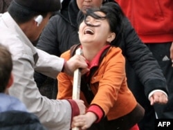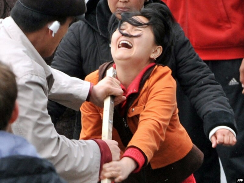 Потасовка сторонников Временного правительства и бывшего президента Бакиева во время митинга в городе Ош 15 апреля 2010 года.