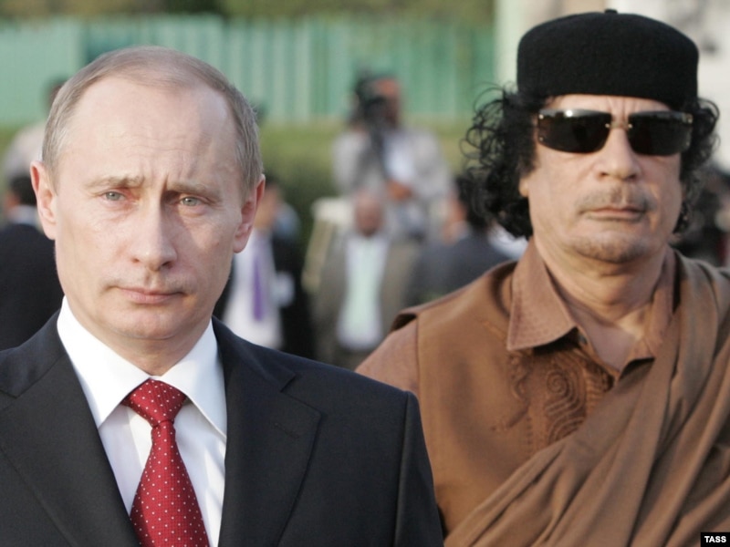 Президент России Владимир Путин и лидер Ливии Муаммар Каддафи в резиденции Каддафи. 16 апреля 2008 года.