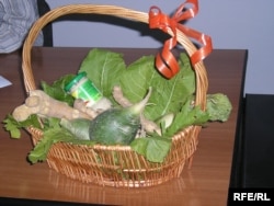 «Корзина с хреном», которую пытаются вручить руководителям БТА банка журналисты газеты «Республика». Алматы, 2 ноября 2009 года.