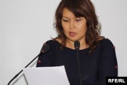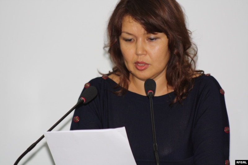 Джамиля Джакишева зачитывает заявление своего мужа, арестованного топ-менеджера Мухтара Джакишева. Алматы, 23 ноября 2009 года.