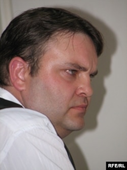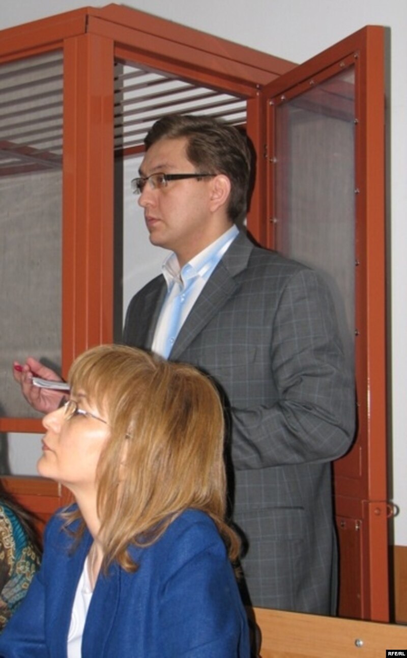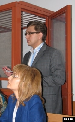 На втором плане - Альжан Бралиев, бывший вице-министр экологии на скамье подсудимых. Астана, 2 июля 2009 года.