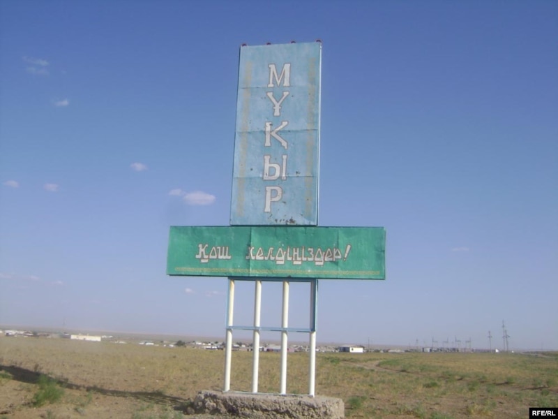 Надпись при въезде в село Мукур "Добро пожаловать". Кызылкогинский район Атырауской области.17 июля 2009 года.
