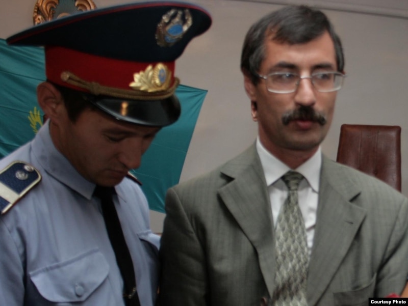 Рамазан Есергепов, осужденный на три года тюрьмы главный редактор независимой газеты «Алма-Ата Инфо», в момент доставки его в здание суда в день оглашения приговора. Тараз, 8 августа 2009 года.