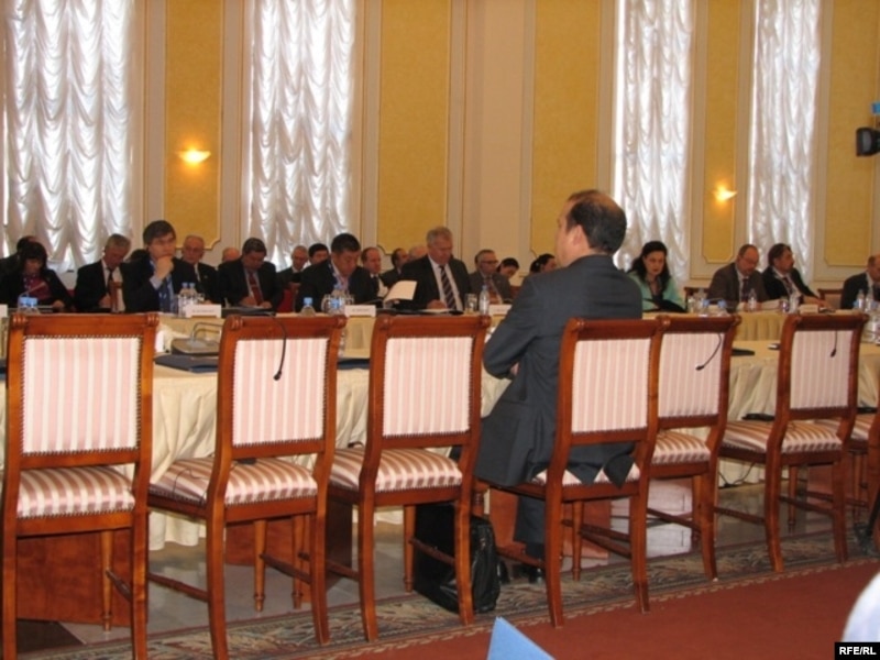 Участники конференции «Председательство Казахстана в ОБСЕ: вызовы и возможности» за столом переговоров. Астана, 28 октября 2009 года.