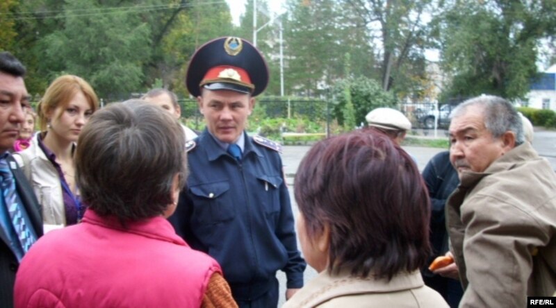 Представители спецслужб беседуют с рабочими завода «Алматинский сахар» во время их акции протеста. Карабулак, 25 сентября 2009 года.