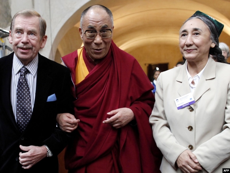 Бывший президент Чехии Вацлав Гавел, духовный лидер Тибета Далай Лама и лидер Всемирного уйгурского конгресса Рабия Кадыр на конференции "Мир, демократия и права человека в Азии". Прага, 11 сентября 2009 года.