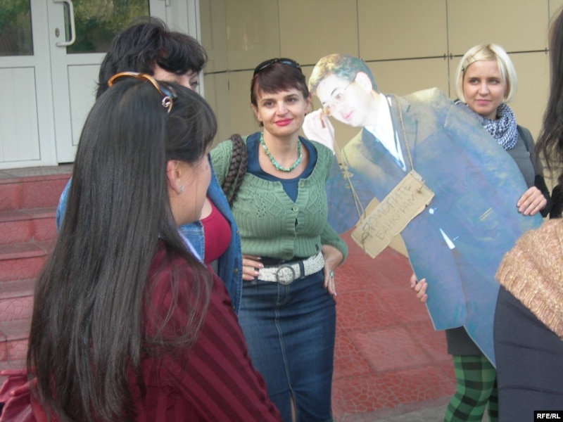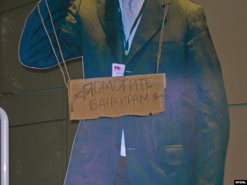 пришли с картонными макетами генерального директора БТА банка Анвара Сайденова и председателя совета директоров БТА банка Армана Дунаева. На шее макетов висели таблички с надписями «Помогите банкирам» и «Помогите банкирам, с 6 марта «не емши».