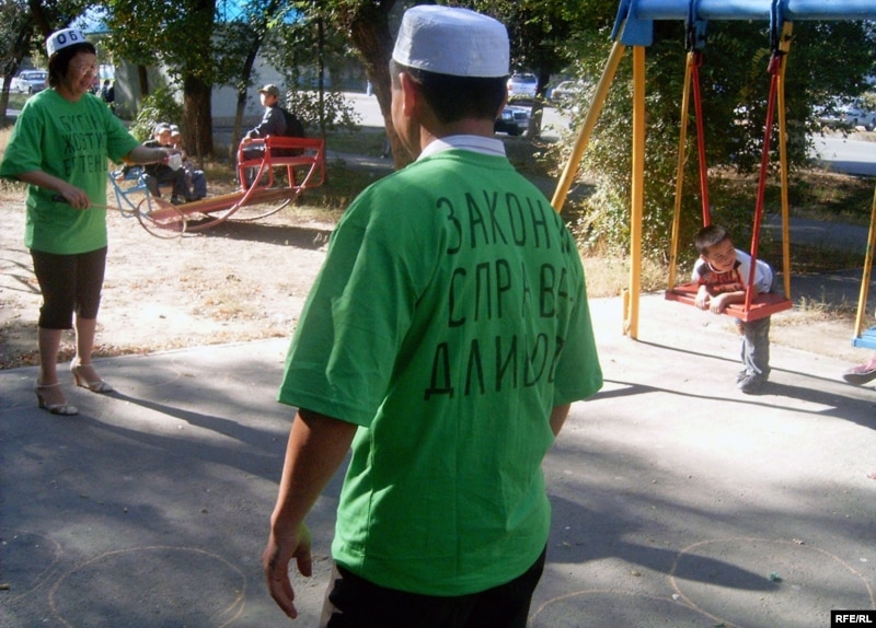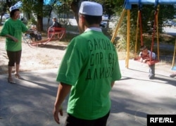 Активисты «Азата» в футболках с надписями «Сегодня – Жовтис, завтра - вы» и «Закон и справедливость». Талдыкорган, 6 октября 2009 года.