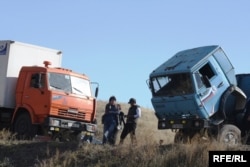 Грузовые автомобили, преградившие дорогу автоколонне сторонников Евгения Жовтиса. Алматинская область, 20 октября 2009 года.