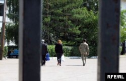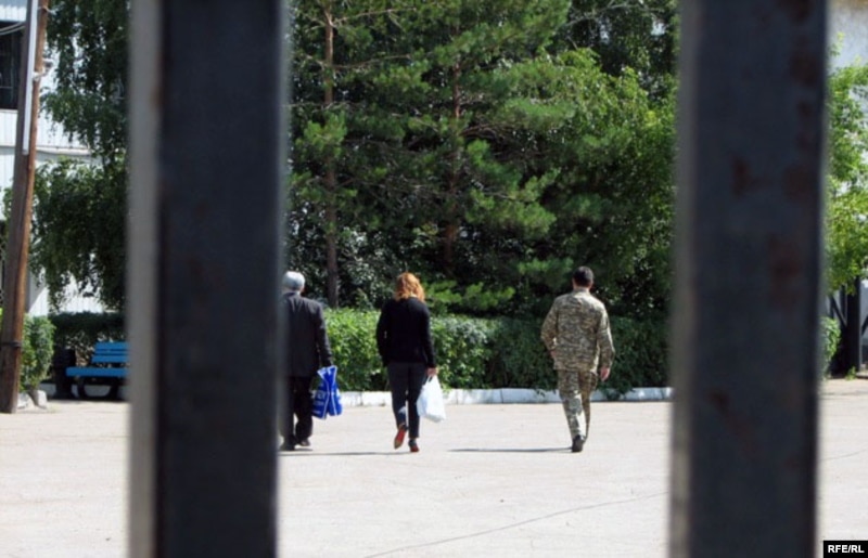 Джамиля Джакишева в сопровождении охранника идет по внутреннему двору тюрьмы КНБ. Астана, 31 июля 2009 года.