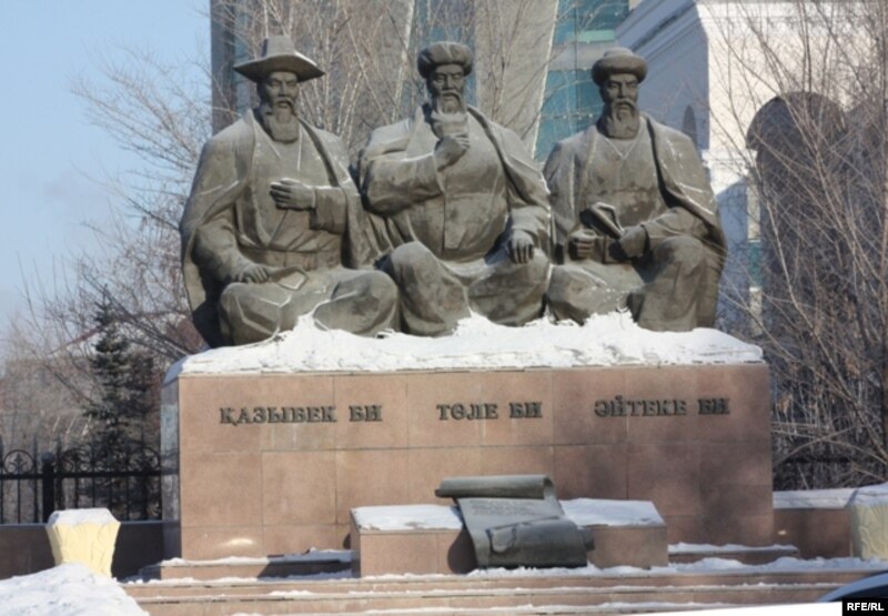 Памятник символам казахского правосудия, известным биям (судьям) Казыбеку би, Толе би и Айтеке би. Перед зданием городского суда Астаны, 12 февраля 2010 года