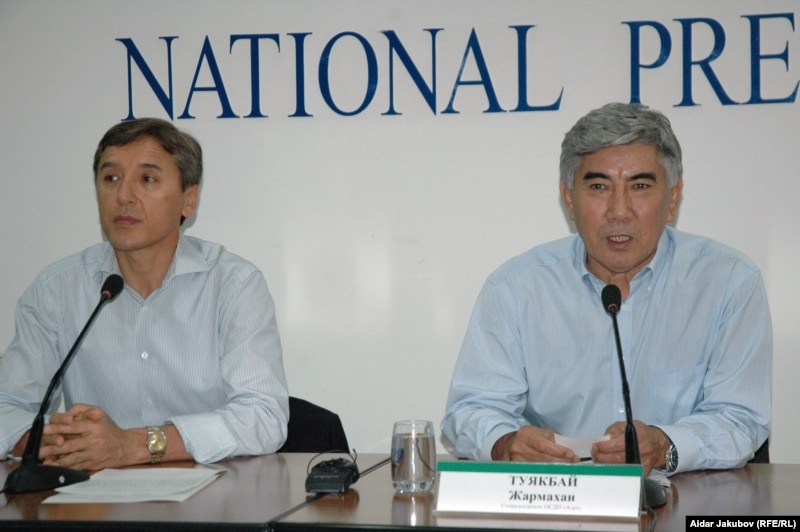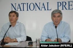 Лидеры партии ОСДП «Азат» Жармахан Туякбай (справа) и Болат Абилов (слева) на пресс-конференции. Алматы, 20 июля 2010 года.