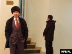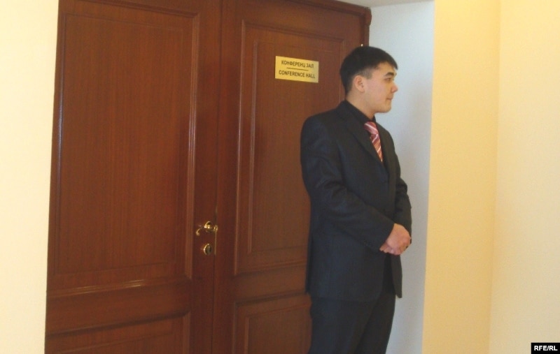 Начальник отдела департамента внутренней политики Атырауской области Оразбек Касымов (слева) наблюдает, чтобы в зал заседания не прошли «посторонние люди». Атырау, 12 февраля 2010 года.