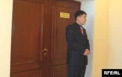 Сотрудник акимата Атырауской области сторожит двери конференц-зала, чтобы туда не прошли «посторонние люди». Атырау, 12 февраля 2010 года.