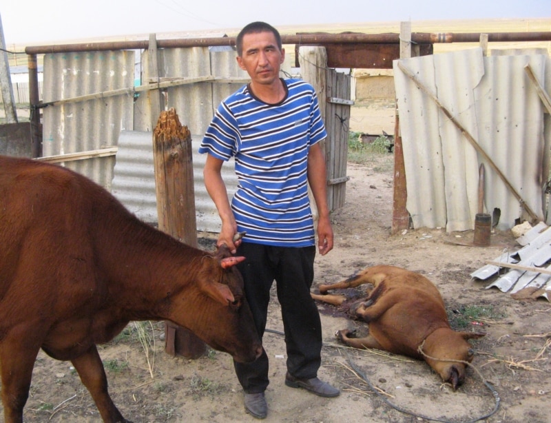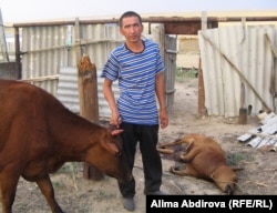 Местный житель Нурлыбек Ургешбаев возле туши убитого во дворе его дома теленка. Актюбинская область, поселок Кенкияк, 10 июля 2011 года.