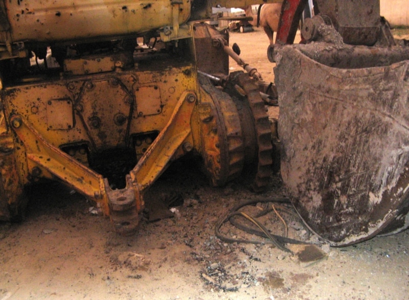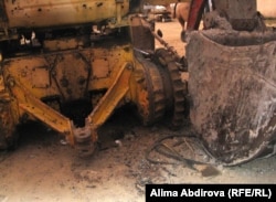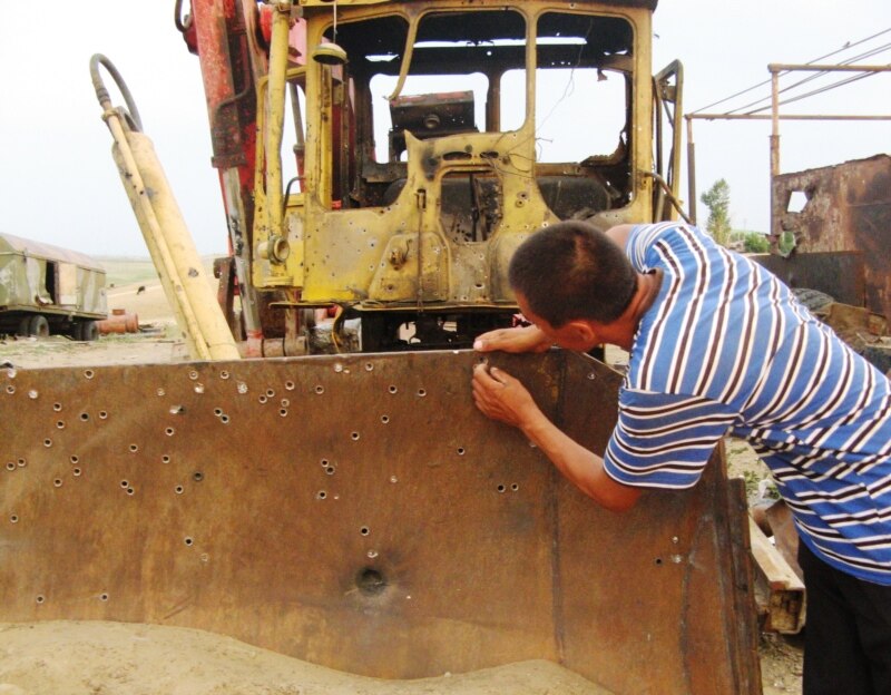 Местный житель Нурлыбек Ургешбаев показывает следы от пуль на спецтехнике возле его дома. Актюбинская область, поселок Кенкияк, 10 июля 2011 года.