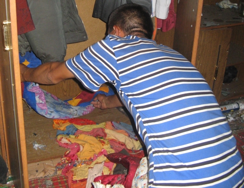 – Жена тоже вышла в огород. Смотрю: стоят четыре омоновца. Они сказали, чтобы мы вошли домой. Потом началась стрельба. Всю ночь стреляли, шел бой. Всё время звонил в полицейский участок по телефону, чтобы нас спасли. Но мне отвечали, чтобы мы потерпели. Фамилию свою не говорил дежурный. Если бы сестра не звонила в полицию, не подняла шум, мы погибли бы, – говорит Нурлыбек Ургешбаев.